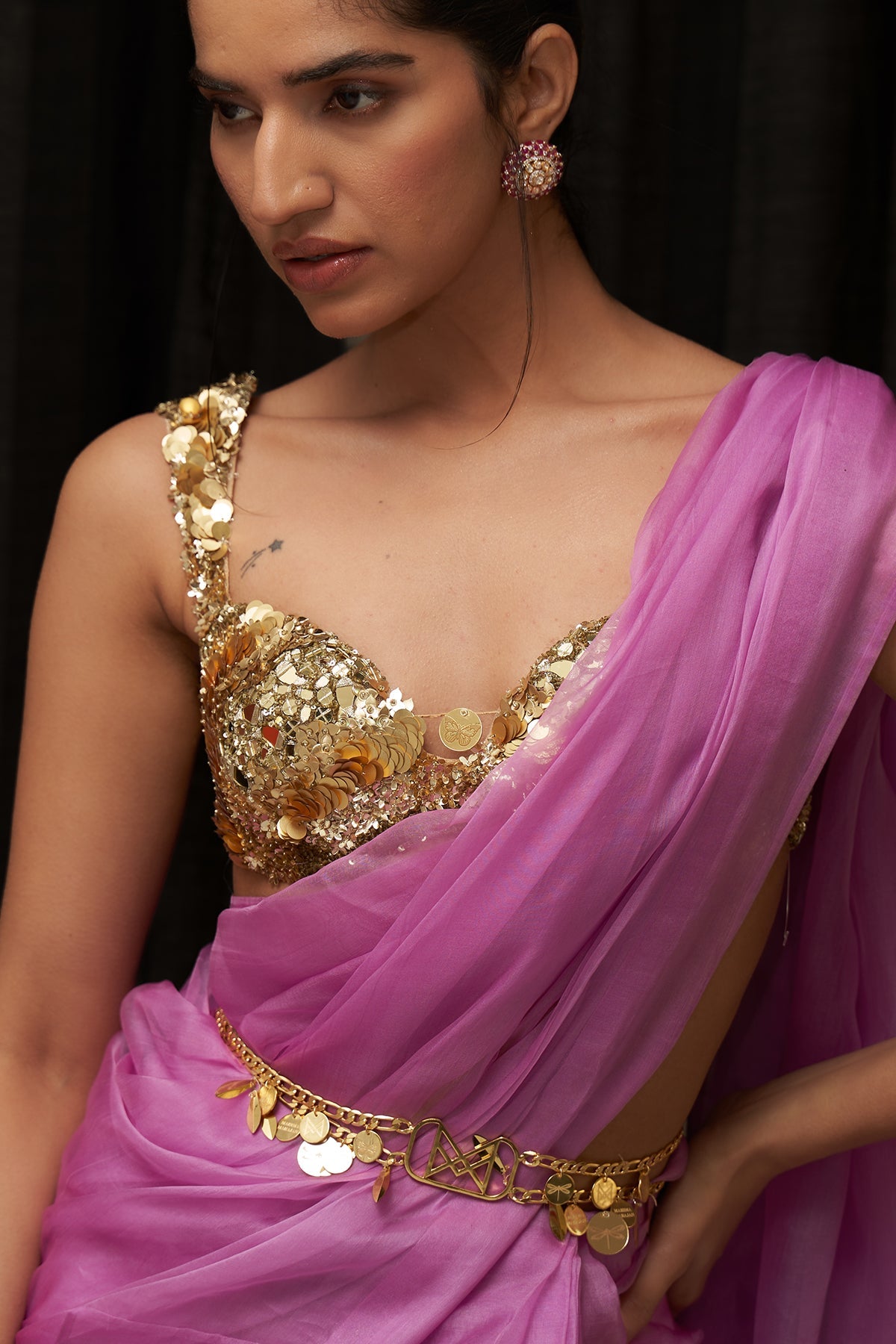 Lilac Pre Draped Saree with Embroidered Blouse and Belt
