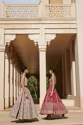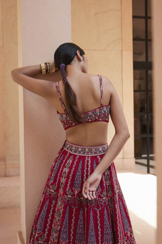 It took a total of 2200 laborious hours to create this skirt set by the skilled women of SEWA (Self Employed Women's Association) a program that empowers craftswomen. Presented in a vintage red, reminiscent of the 1950s.