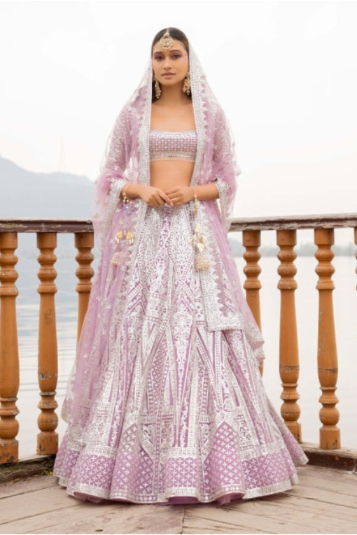 - MULBERRY PURPLE LEHENGA WITH ARCHITECTURAL, TRADITIONAL AND GEOMETRIC MOTIFS IN PRINTED CHROME APPLIQUE AND ADORNED WITH SEQUINS AND MIRROR WORK DETAILS. THE LEHENGA SKIRT IS PAIRED WITH A BLOUSE HAVING MIRRORS, SEQUINS AND TASSELS; AND A BORDERED TULLE DUPATTA WITH MOTIFS REPLETE WITH MIRRORS AND SEQUINS.