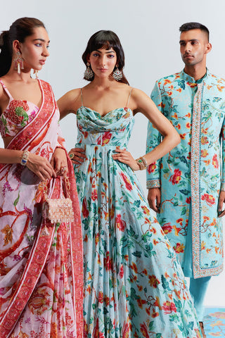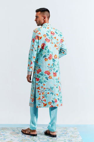 Blue textured cotton embroidered sherwani, satin organza kurta and churidaar set