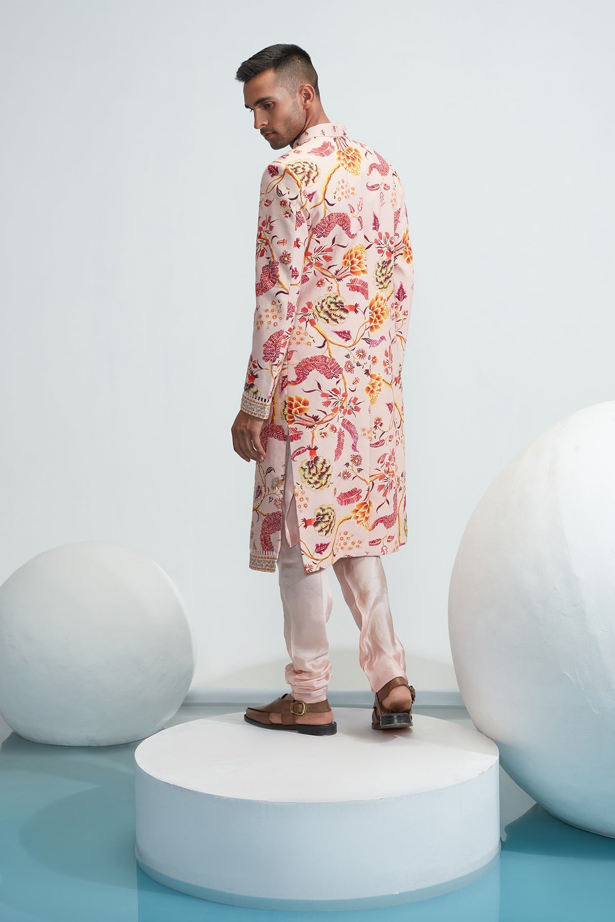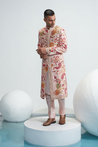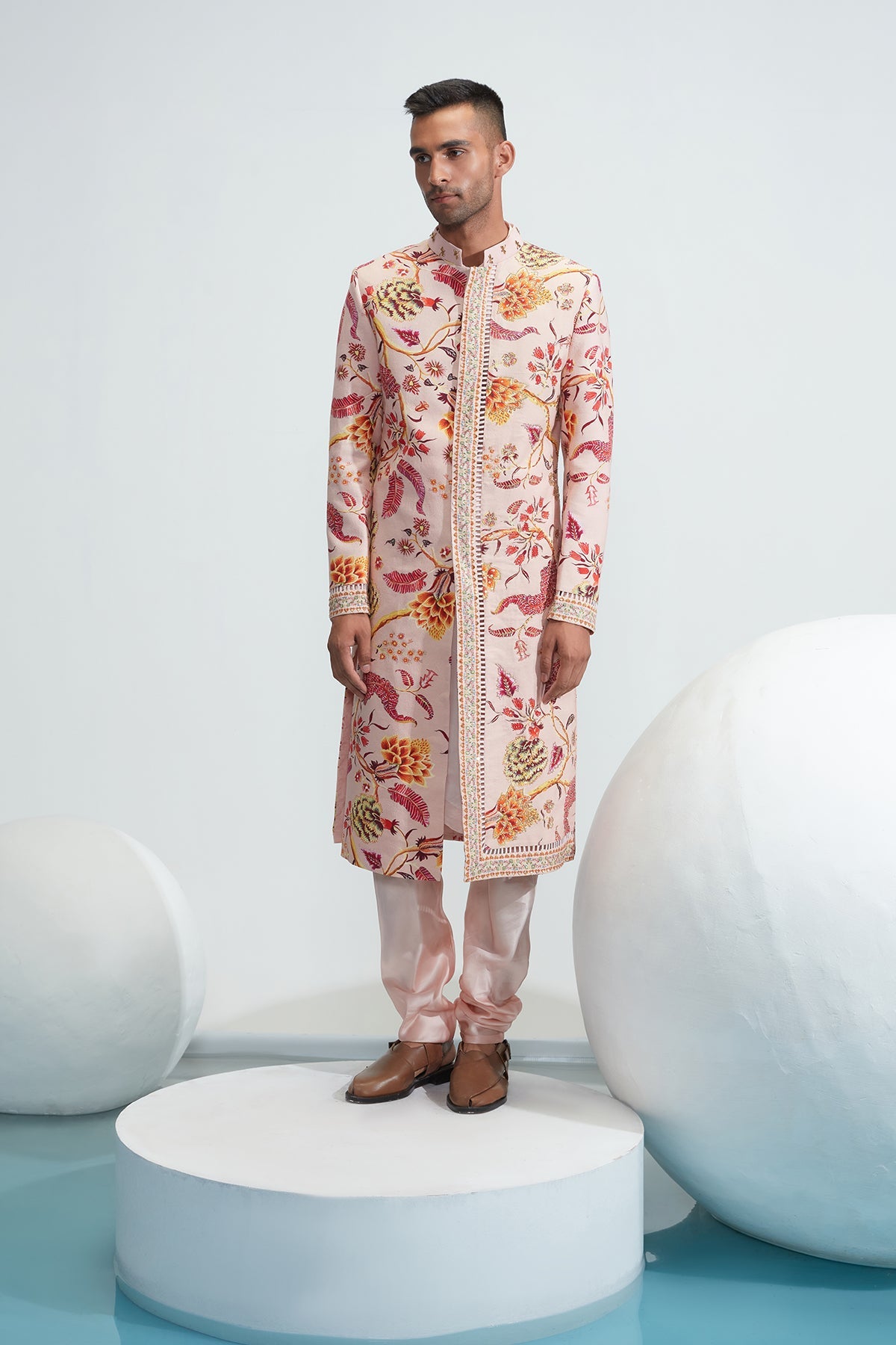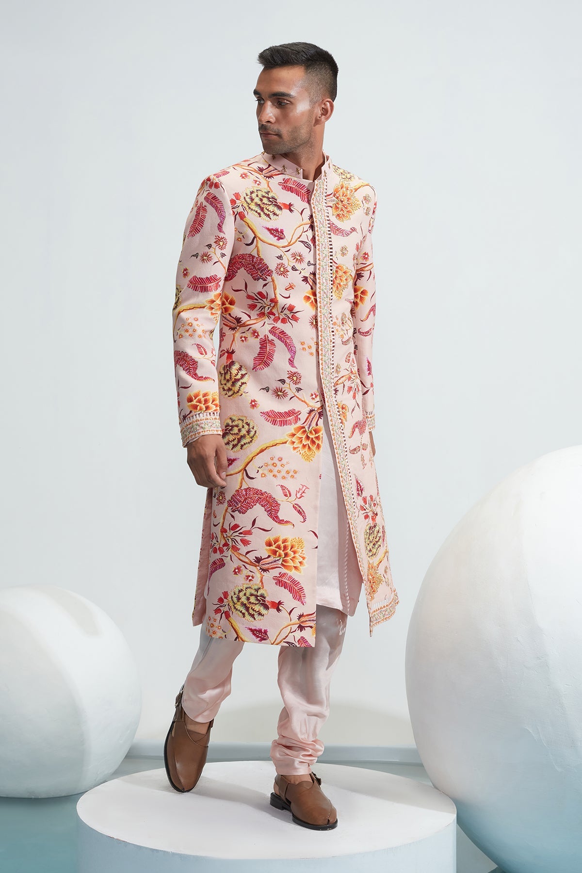 Nude textured cotton  embroidered sherwani, satin organza kurta and churidaar set