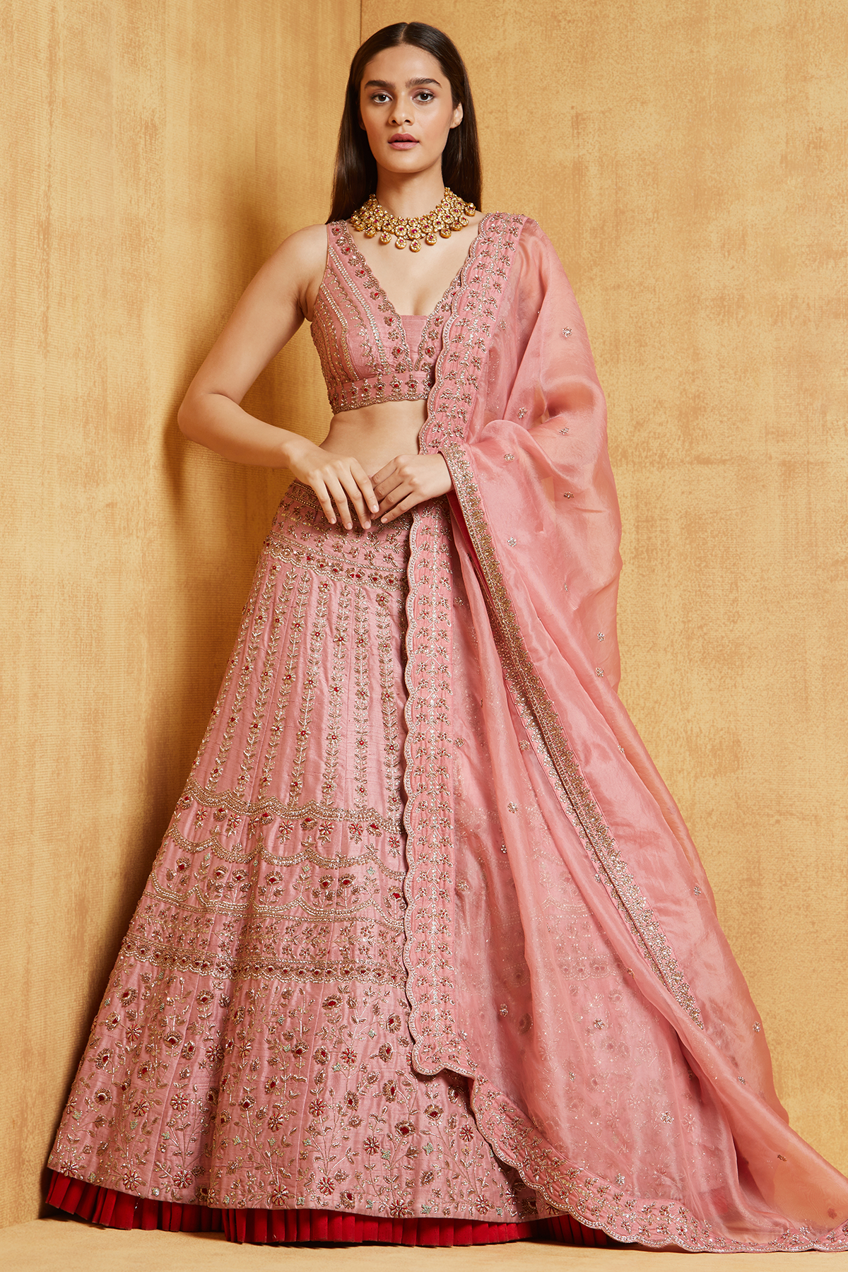 Silk hand embroidered lehenga with Zardozi paired with an embellished blouse and organza dupatta