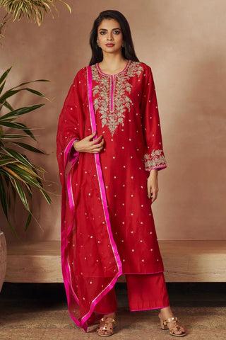 RED DUPION SILK ZARDOZI EMBROIDERED "ASTRA" KURTA PAIRED WITH COTTON SILK PANTS AND ORGANZA CHITTA DUPATTA