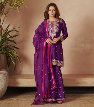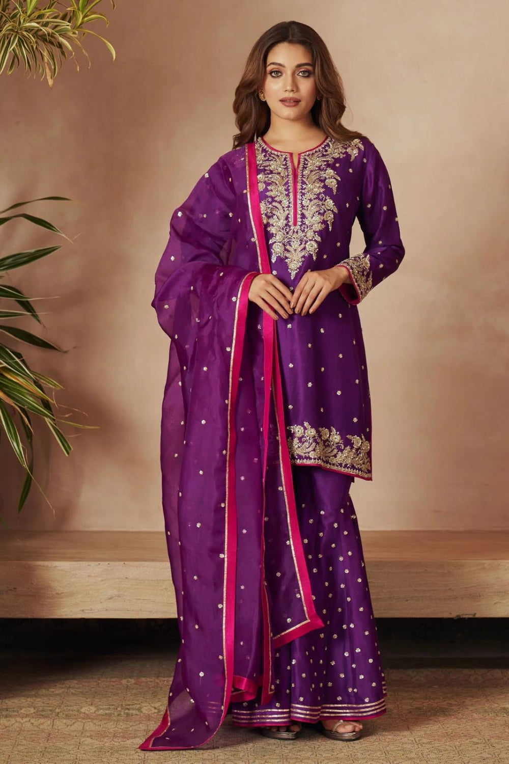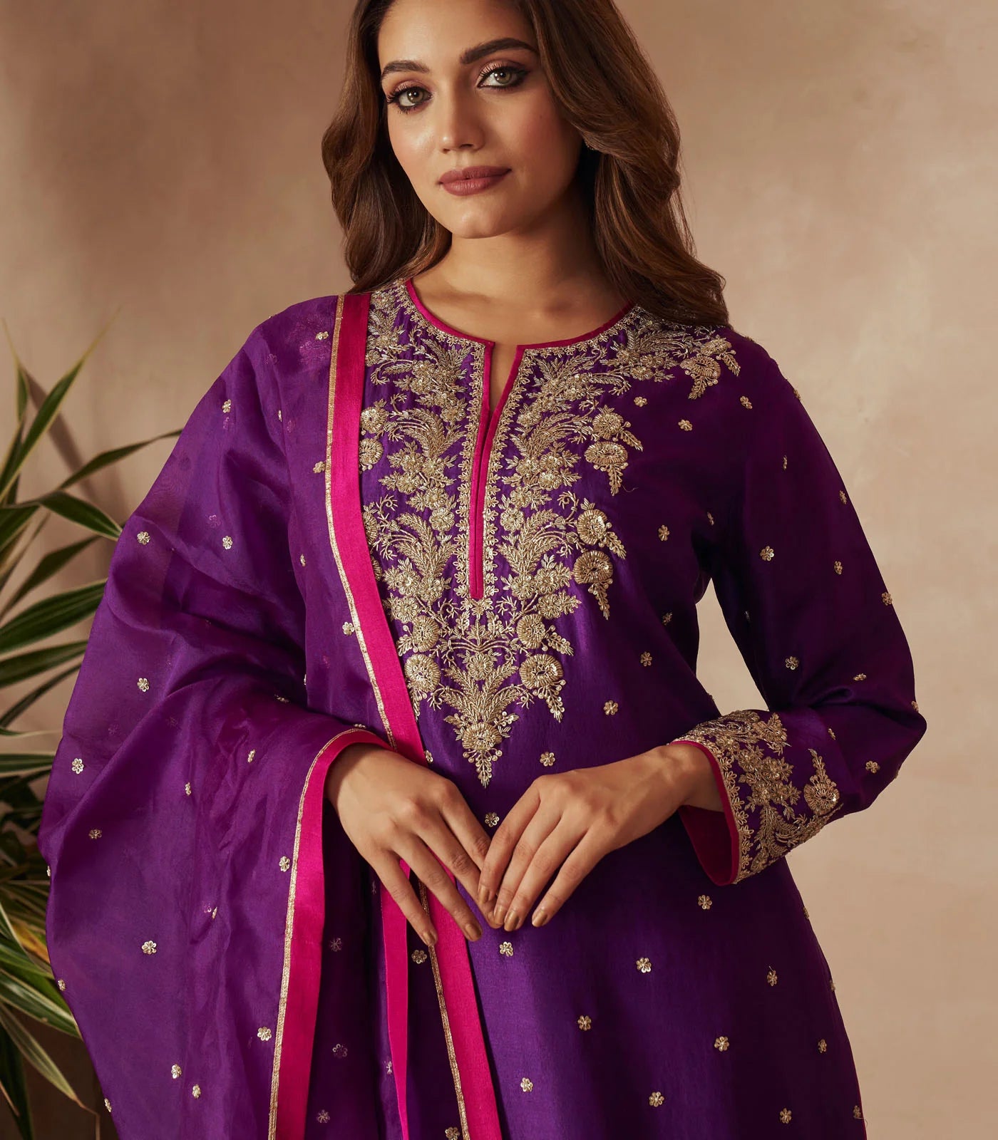 ORANGE DUPION SILK ZARDOZI EMBROIDERED "ASTRA" KURTA PAIRED WITH COTTON SILK PANTS AND ORGANZA CHITTA DUPATTA