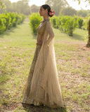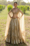 • LIGHT GOLD LEHENGA ENCRUSTED WITH SEQUINS ON GEOMETRIC MOTIFS AND TEAMED WITH A HANDCRAFTED BLOUSE WITH TASSEL DETAILING. THE LEHENGA IS STYLED WITH A TULLE DUPATTA HAVING CHROME APPLIQUE MOTIFS.