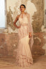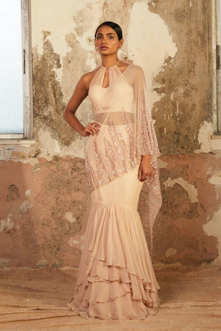 Beige crepe corset crop featuring a gold metal buckle detail and high neck paired with a georgette layered skirt with an attached drape featuring gold and champagne toned linear hand embroidery.