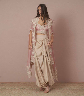 Withstanding the test of time, our pink 'Ayline' cape set comes with pink organza, pearl embroidered corset blouse, and cape that is pared with a dupion silk drape skirt, adding to its charm.
