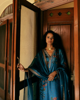 Featuring an azure blue placement print kurta with embroidered neck and sleeve details in Dupion silk. It is paired with a solid chanderi silk pant and an embroidered organza dupatta.