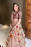 Banarasi lehenga hand embroidered with the classic marodi work teamed with a classic Nandi croptop and a hand painted kalamkari duppata embellished with intricate embroidery.