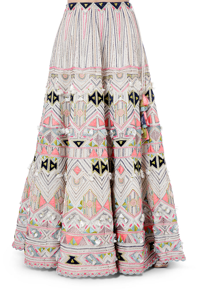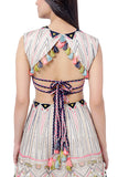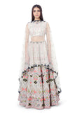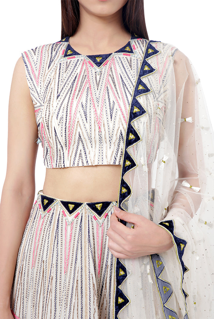 Designer Payal Singhal: Chalk White colour georgette embroidered back tie-up choli with lehenga and net mukaish embroidered dupatta