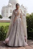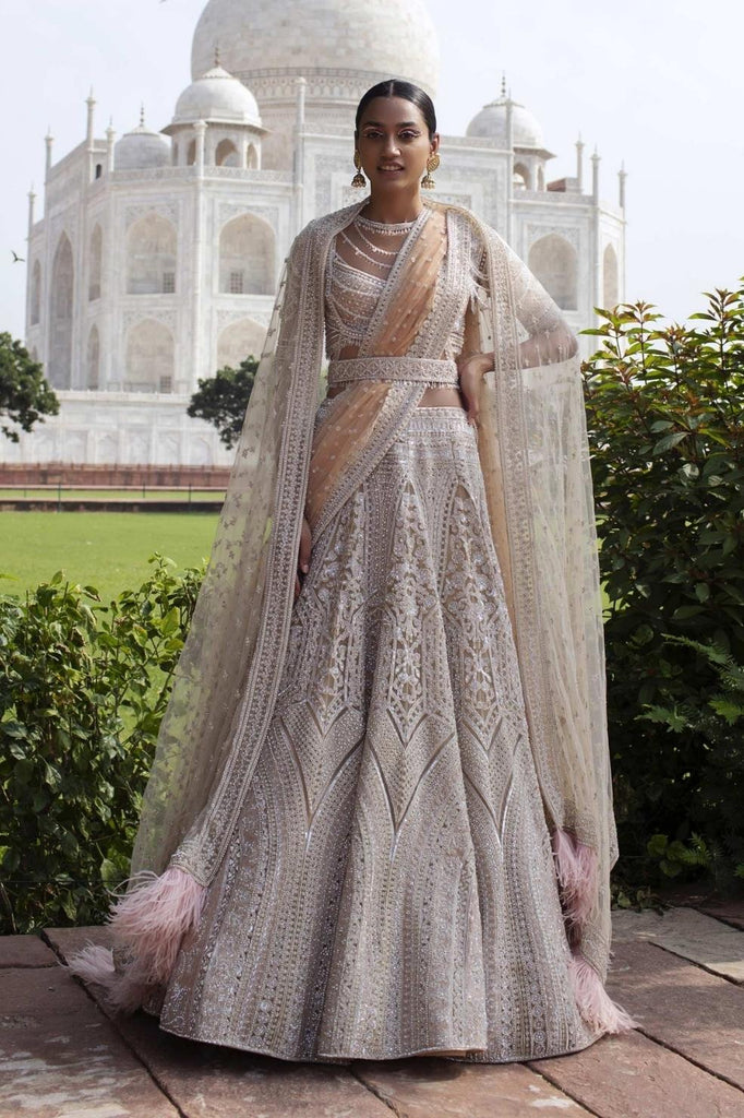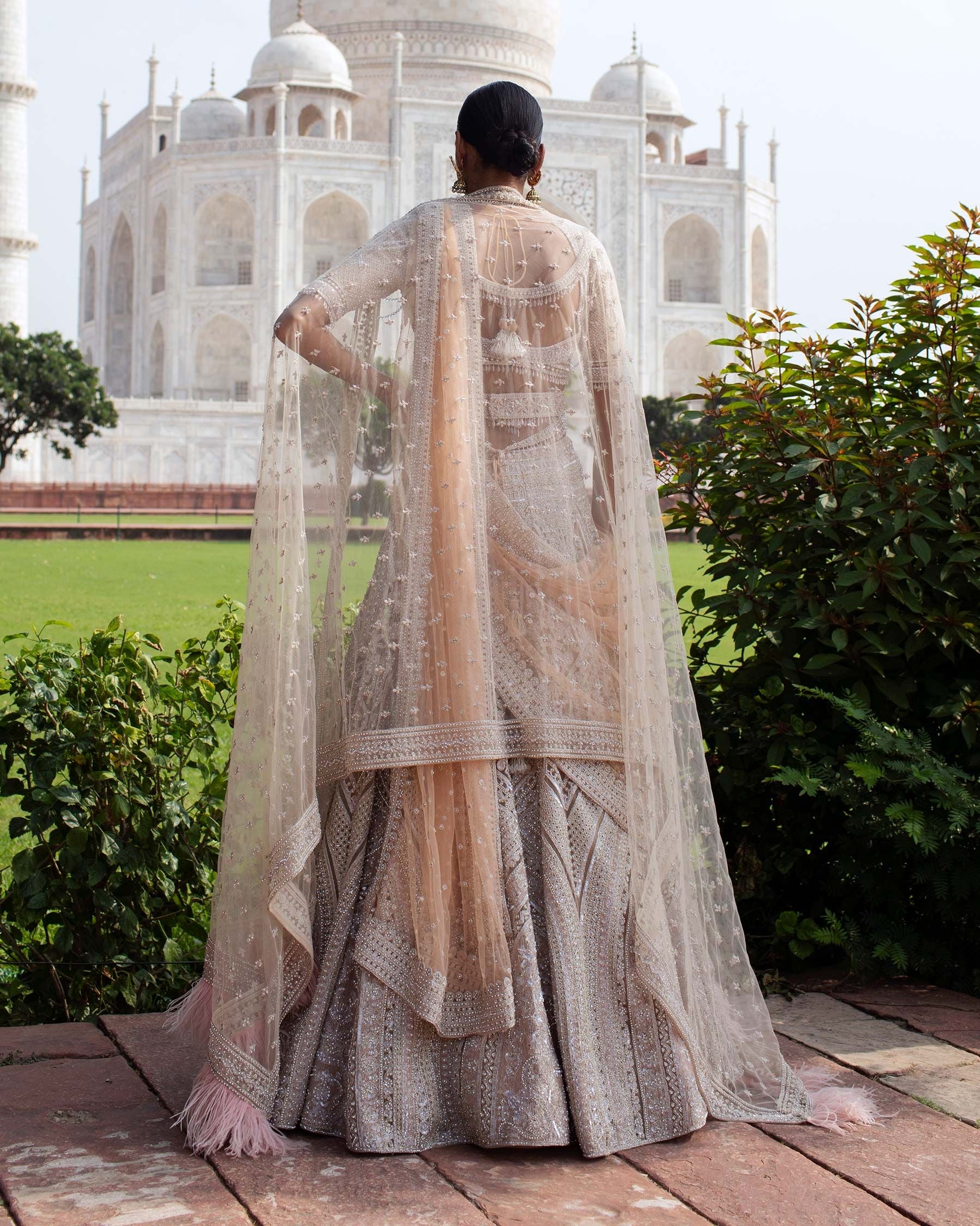 - BEIGE-BASED LEHENGA HANDCRAFTED WITH METAL THREADWORK, CRYSTALS AND BEADS DETAILING ON ETHNIC MOTIFS.