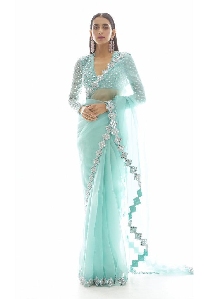 Silk organza mirror border saree with a sequin hand embroidered v-neck blouse.