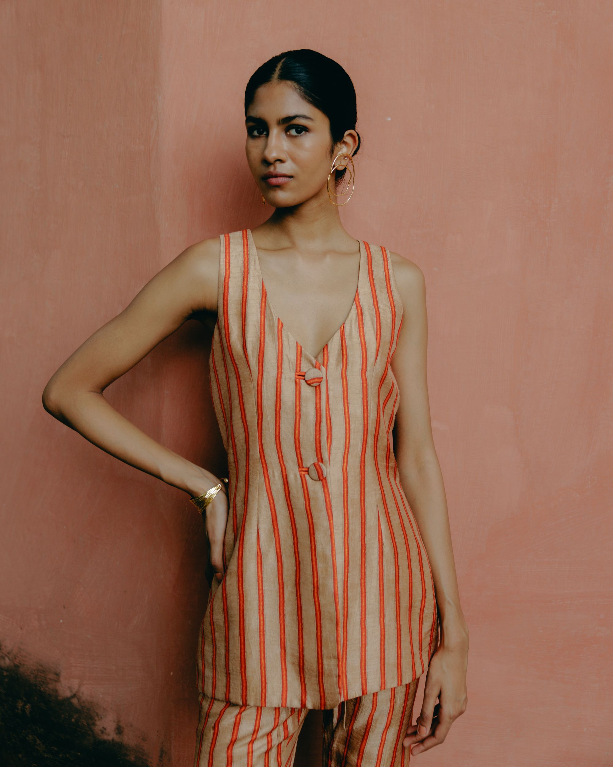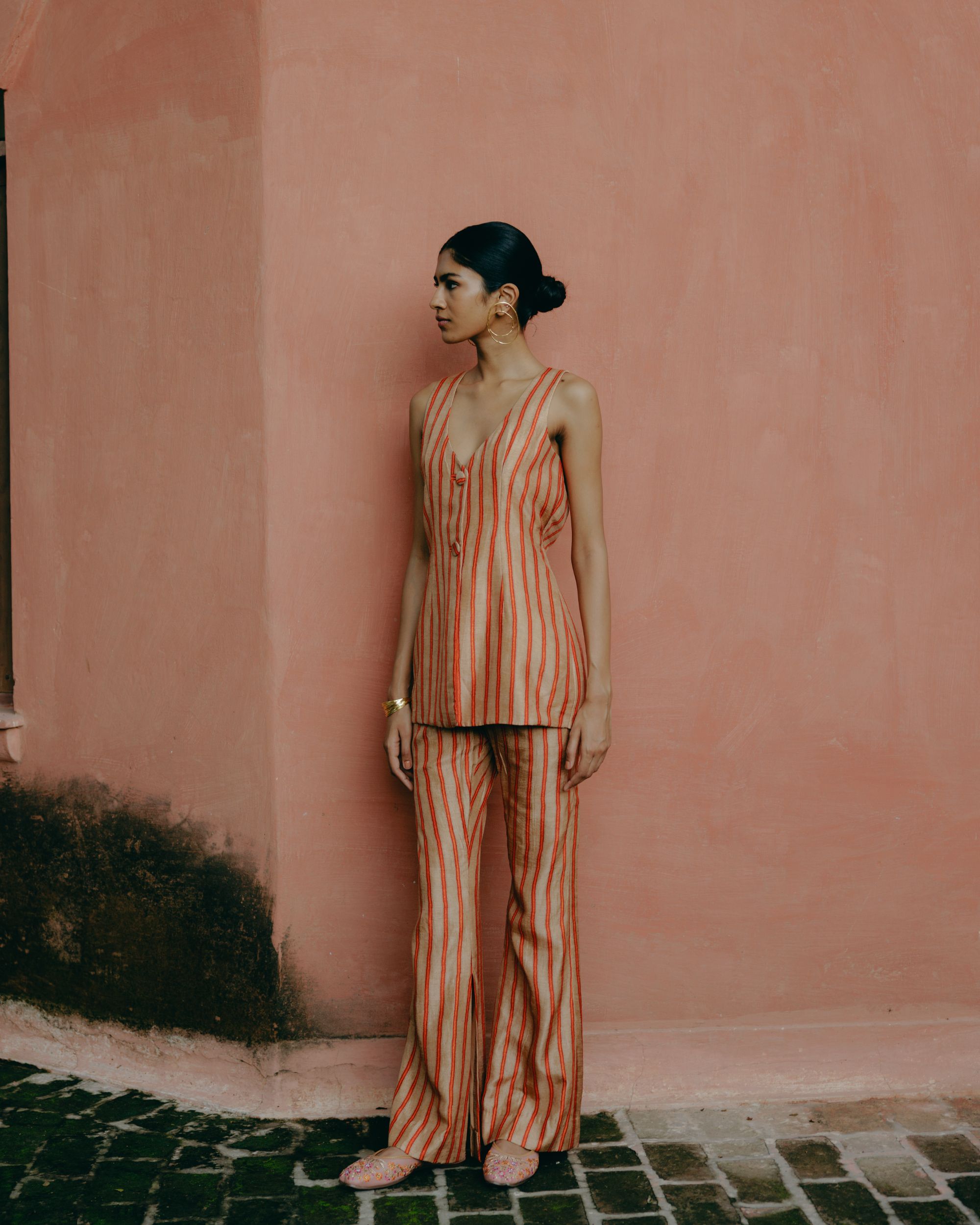 Featuring a biscuit brown printed waistcoat top paired with a printed bell bottom pant.