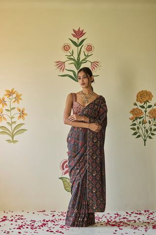 Black printed silk saree highlighted with detailed thread and bead work through the whole saree teamed with a hand embroidered threadwork blouse.