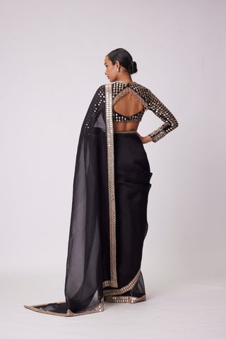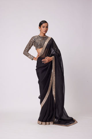 Black Hand Embroidered Organza Saree Clubbed with Real Hand Cut Mirror Embroidered Full Sleeve Blouse.