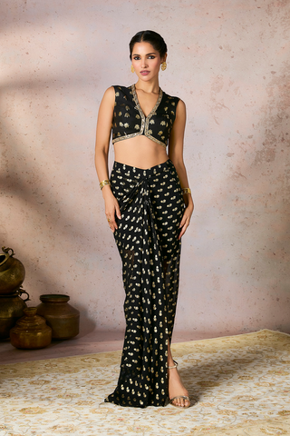 Details: Blouse- Foil printed blouse adorned with embroidered borders | Sleeveless | 'V' Neckline| Centre front closure Drape Skirt- All over printed drape skirt | Side slit detail | Side Seam Closure