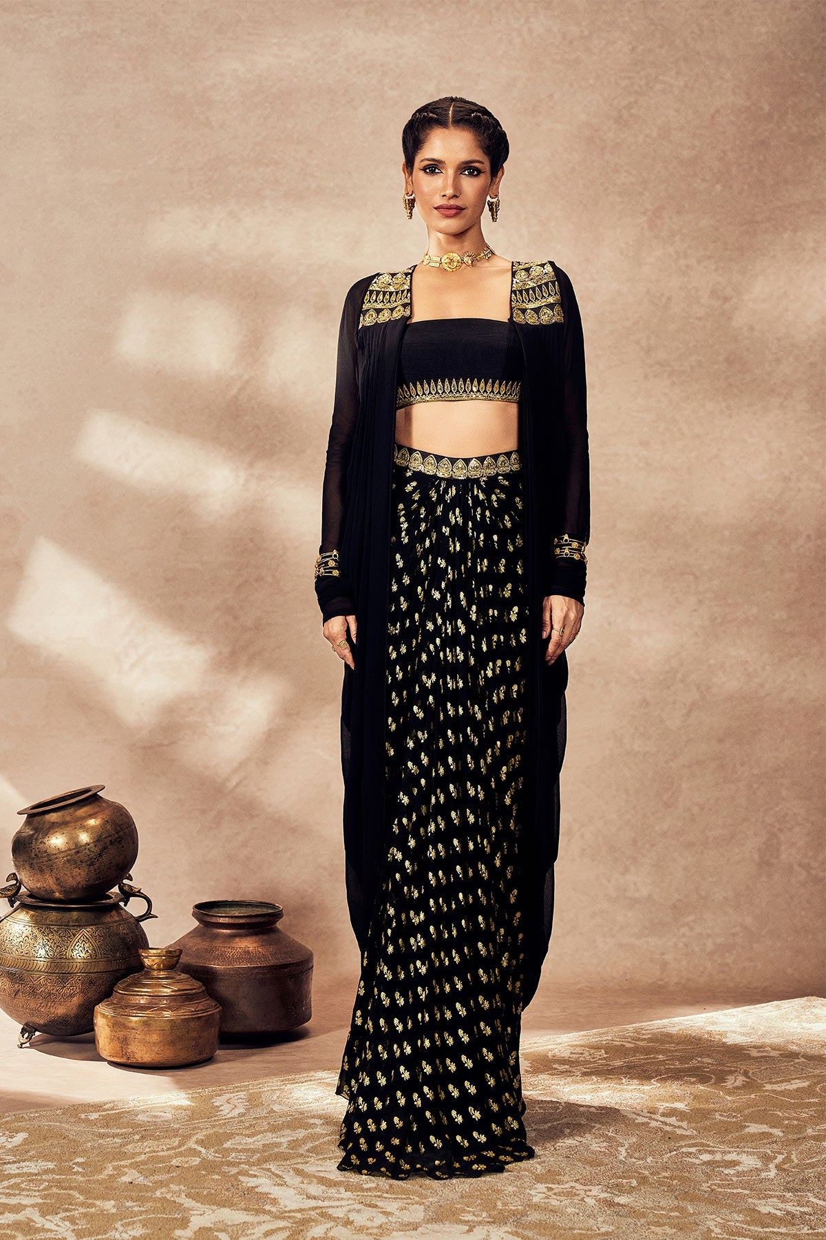 Details: Jacket- Sheer drape jacket | Yoke made with beautiful sequin and dori embroidery | Sheer chudi Sleeves Skirt- All over printed drape skirt with waistbelt embellished with embroidered border | Centre back closure Bustier- Bustier with centre back closure | Embellished with embroidered border | Detachable straps