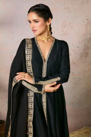 Details: Kurta- A- line kurta is embellished with embroidered borders around the neckline and hem | 'V' neckline | Full sleeves adorned with gold sequin and dori motif embroidery and border Pant- Black straight pants embellished with embroidered border at the hem | Side seam closure Dupatta- Printed organza dupatta | Embellished with embroidered border and edged with kinari