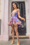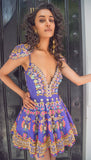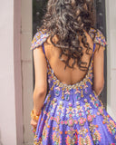 A purple scallop babydoll dress in raw silk, embroidered with, 3D leaves, gold plated metal pieces, colored and reflective sequins, glass stones, glass cut beads, "ghungroos" and colored beads