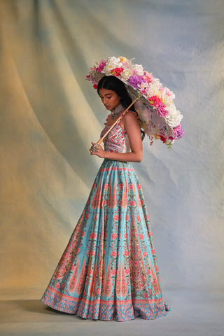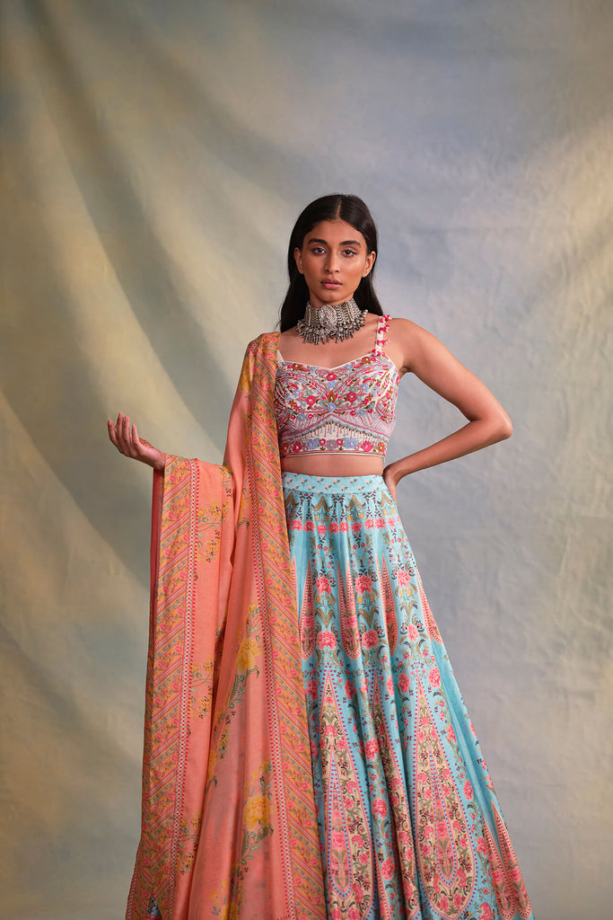 Multicolour blue lehenga printed in beauitful shades of pinks with intricate motives teamed with a pink floral duppata and a hand embroidered threadwork bustier