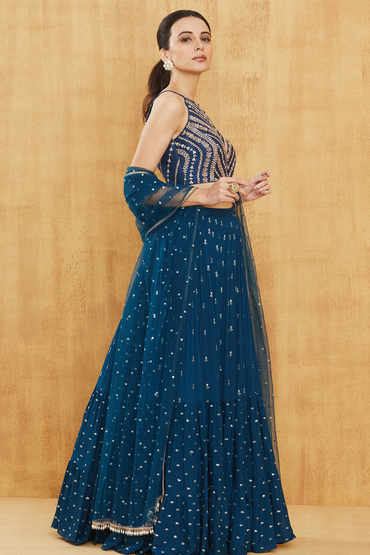 Sequins embellished georgette isabella skirt paired with an embellished halter blouse and tulle dupatta.