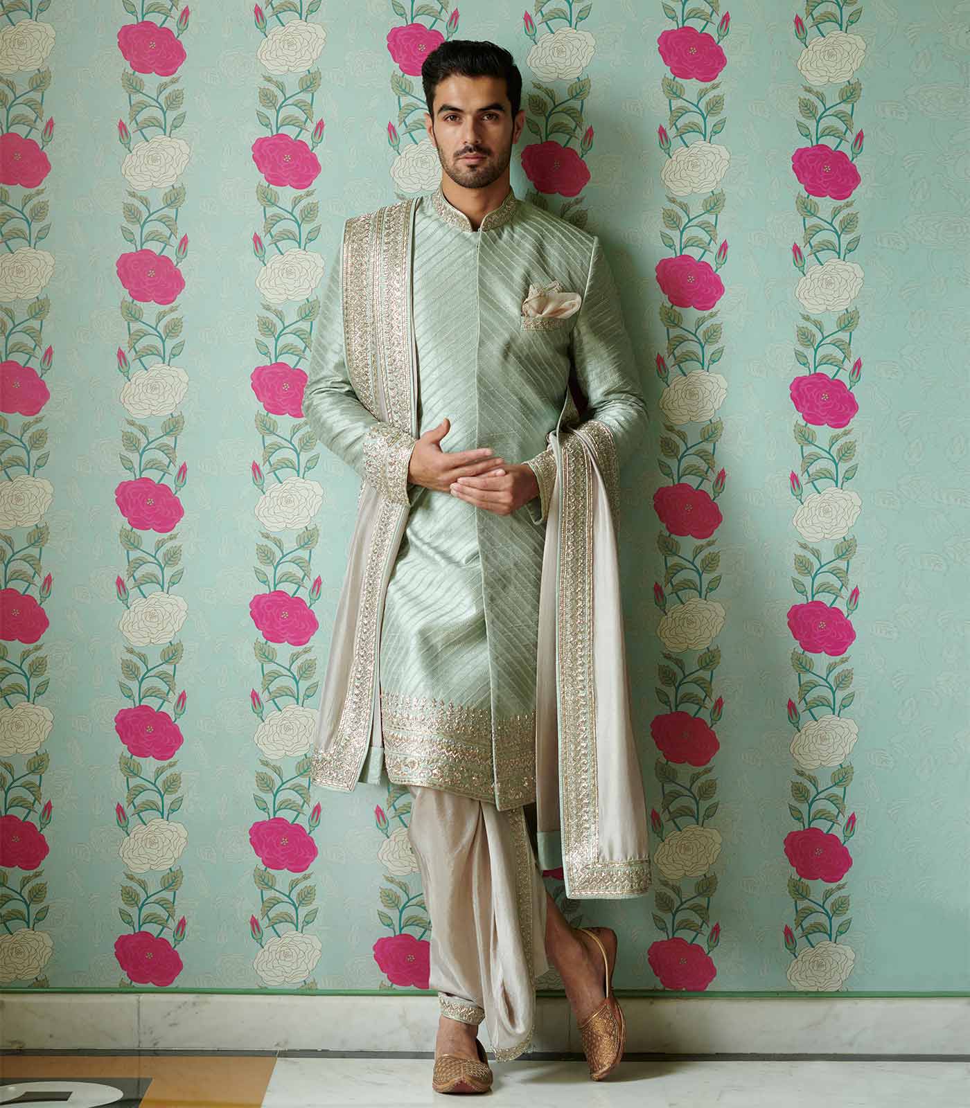 Blue tissue rawsilk diagonal thread and zardosi embroidered sherwani set