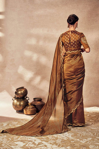 Details: Saree- Brown pinstripes tissue | Adorned with gold madakal embroidery and gota kaam