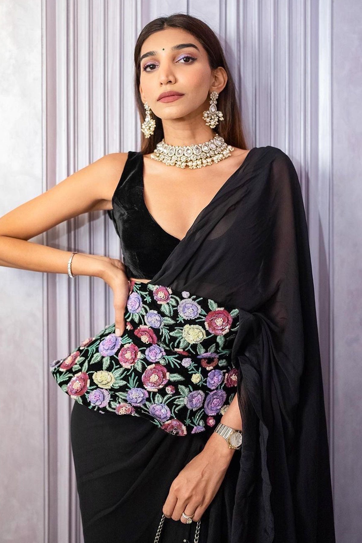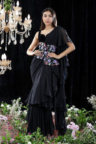 Black Organza And Georgette Ruffled Saree, Velvet Blouse With Embroidered Belt
