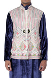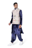 Chalkwhite colour georgette embroidered bandi with navy colour velvet kurta and jogger pant.
