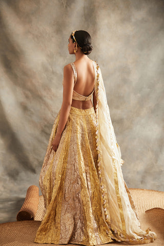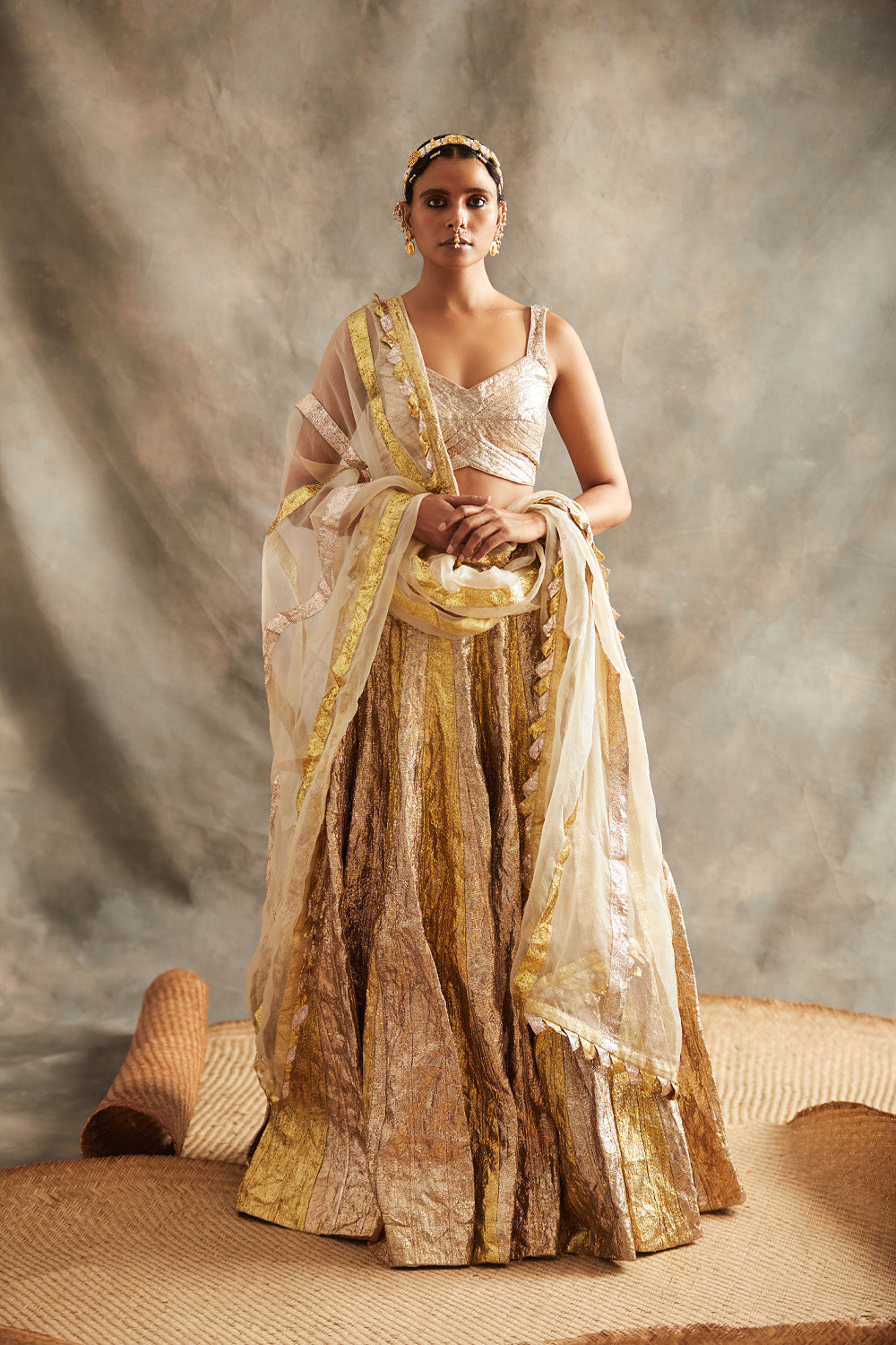 Gold Silver Woven Zari Crinkled Lehenga Teamed With Silver Woven Blouse Accentuated With Organza Dupatta With The Touch Of Lampi Strips And Traingles