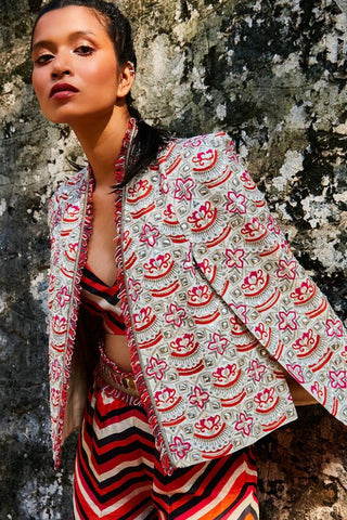 Color block graphic print coord set teamed with ivory embellished noor jacket