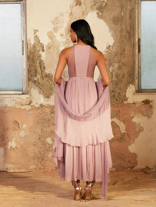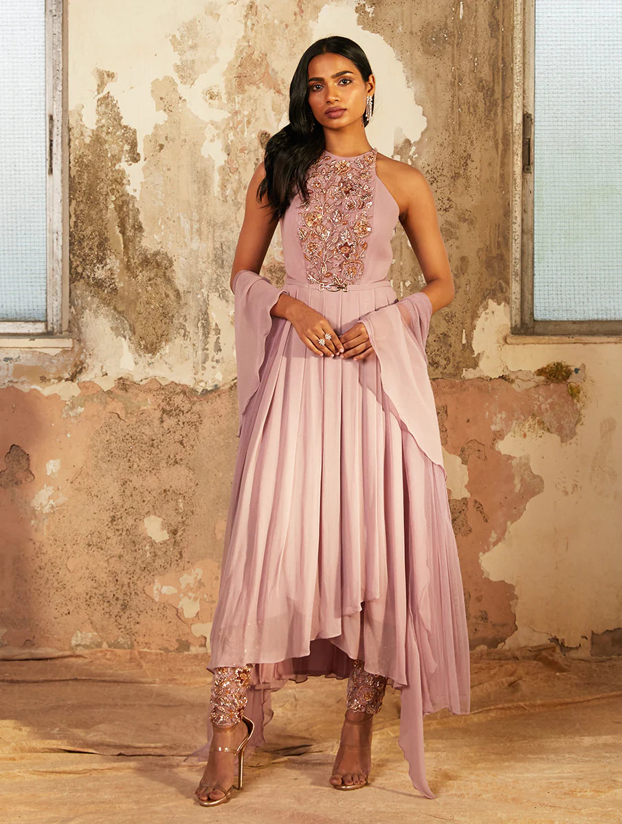 Lilac georgette overlap pleated kurta featuring 3D gold embellished front yoke and a matching sheer embellished pant and a ruffle dupatta.