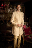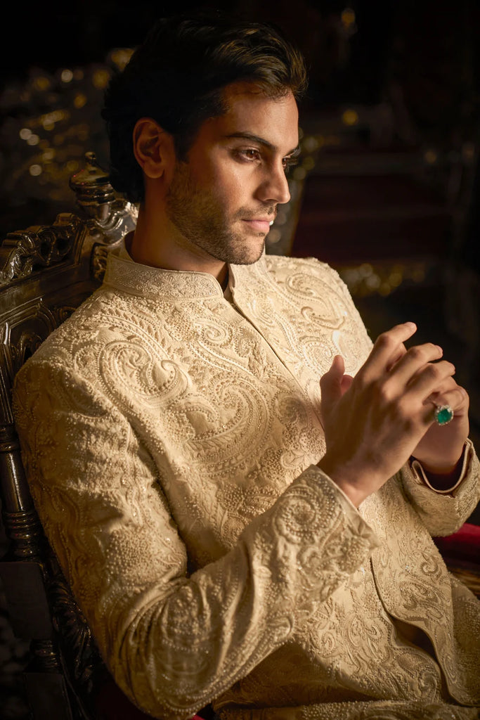 This set features thread embroidery in tonal colors highlighted with intricate pearls and beads. It is paired with matching silk kurta and light beige pants. Complimenting footwear is also available.