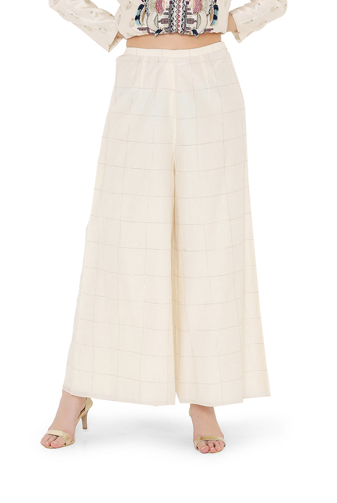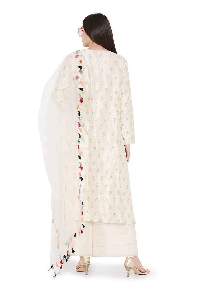 Designer Payal Singhal: Cream benarasi silk yoke embroidered kurta with chanderi checks palazzo and net dupatta with colorful tassel detailing