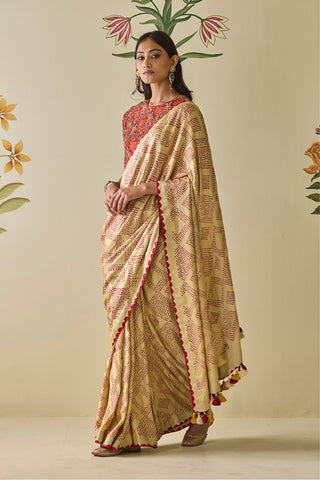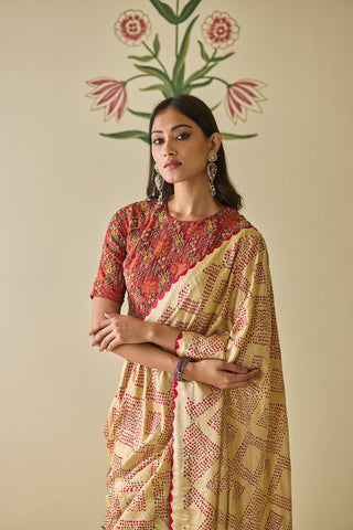 Cream & Red bandhani saree with a red Nazaha printed blouse highlighted all over with hand embroidery.