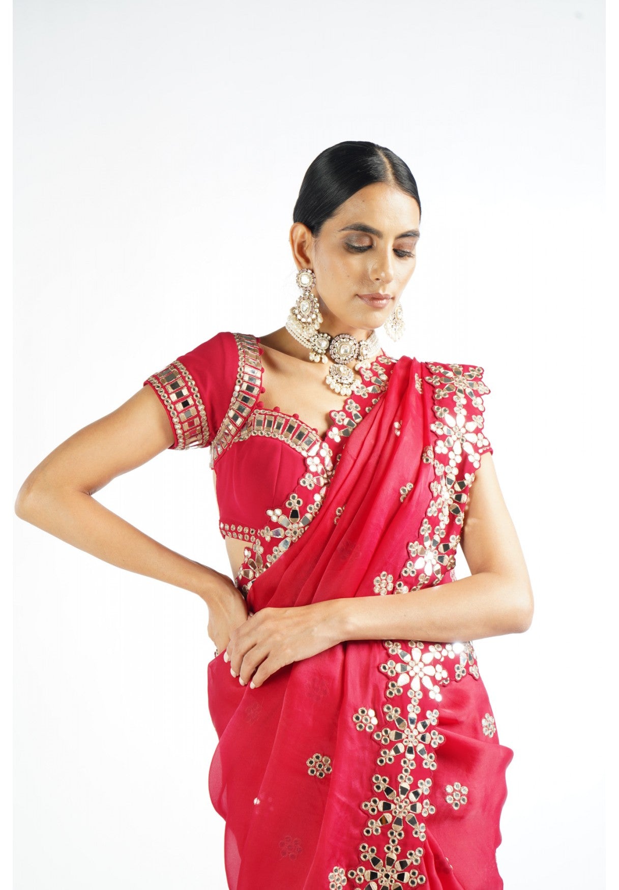 Satin organza saree embroidered with real hand cut mirrors clubbed with mirror work blouse