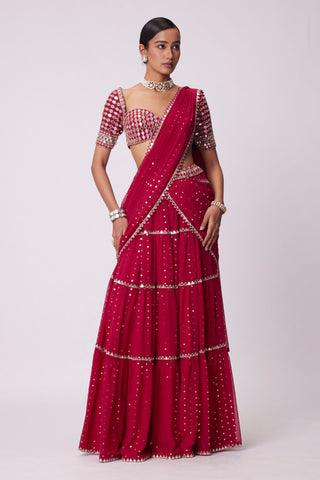 Crimson Red Multi-tier Saree with Real Hand Cut Mirror Embroidered Elbow Sleeve Length Blouse.
