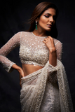 Seema Gujral : This jewelled white saree features all over pearl and crystal embroidery on softest tulle and is paired with a full sleeve blouse.