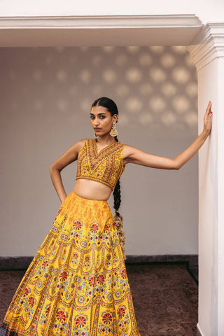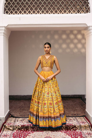 Multi print lehenga in a fresh yellow with hues of fresh colours teamed with a hand embroidered croptop.