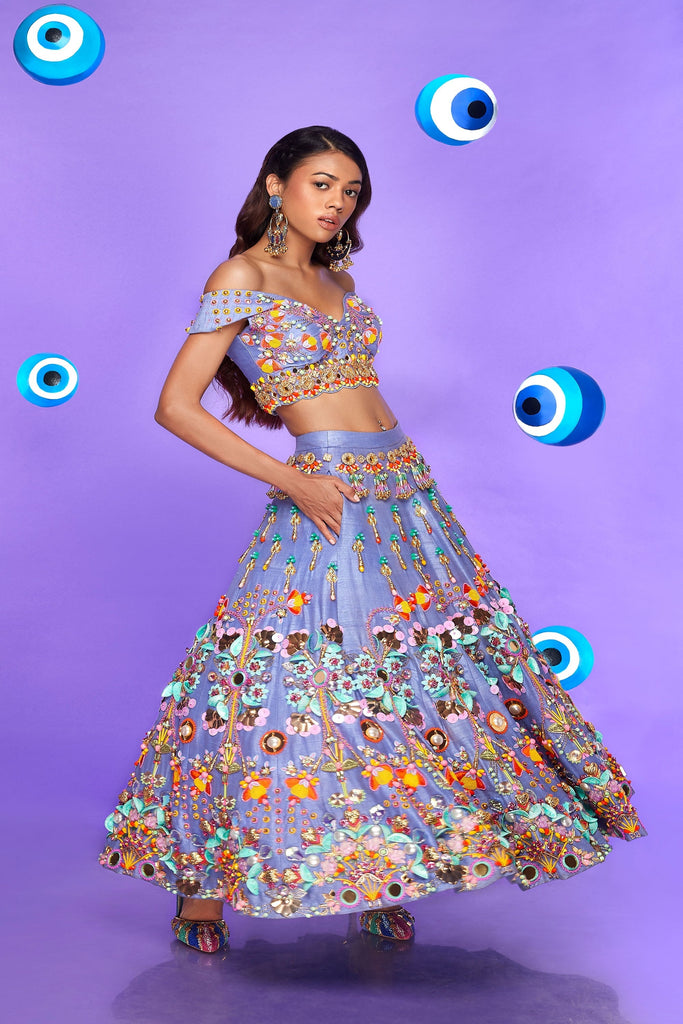A raw silk half lehenga in lilac embellished with pearls, metal pieces, and glass cut beads. Paired with an off-shoulder embellished raw silk blouse in lilac