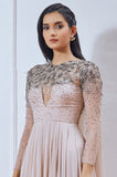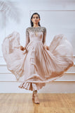 Dusty pink full sleeve georgette ankle-length anarkali with net embellished bodice & plain net churidar pants.