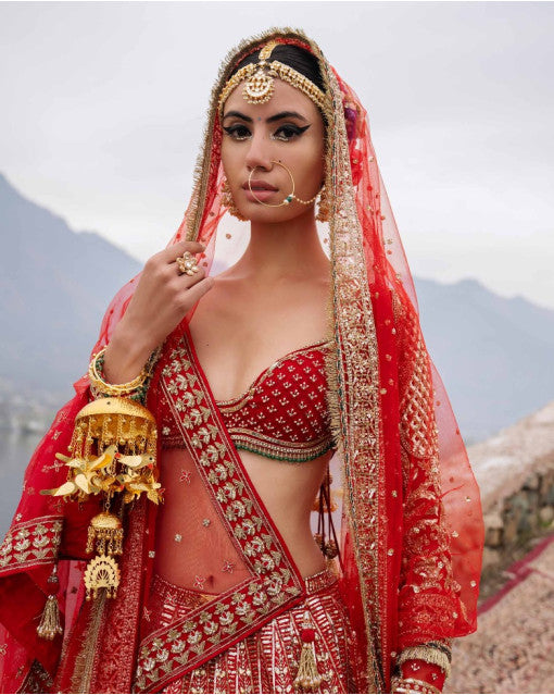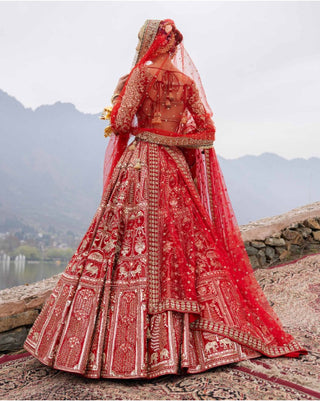 • RED LEHENGA FEATURING ARCHITECTURAL, ANIMAL AND FOLIAGE MOTIFS IN GOLDEN CHROME APPLIQUE. THE LEHENGA IS STYLED WITH A HANDCRAFTED BLOUSE FINISHED WITH GREEN TASSELS DETAILING, AND 1 TULLE DUPATTAS WITH BORDER.