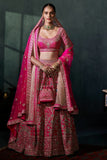 Anita Dongre : Resplendence takes a rare form in our pink silk Era Lehenga. The shimmering gold and silver hand embroidery takes after motifs of royal architecture and the glistening details are realised with zardozi embellishments. Pockets come included.