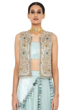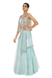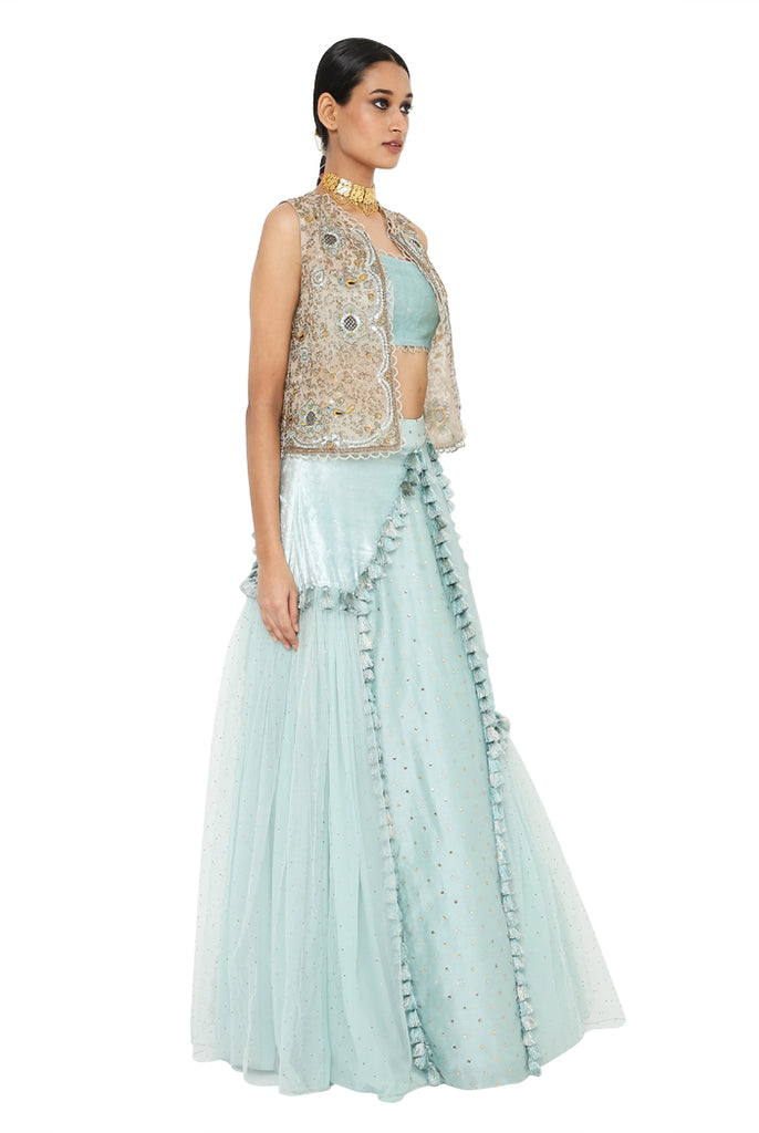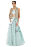 Designer Payal Singhal: Stone Colour Organza Embroidered Jacket With Powder Blue Colour Velvet Bustier And Velvet, Mukaish Silkmul, Organza, Mukaish Net, Georgette Multi Kali Lehenga.