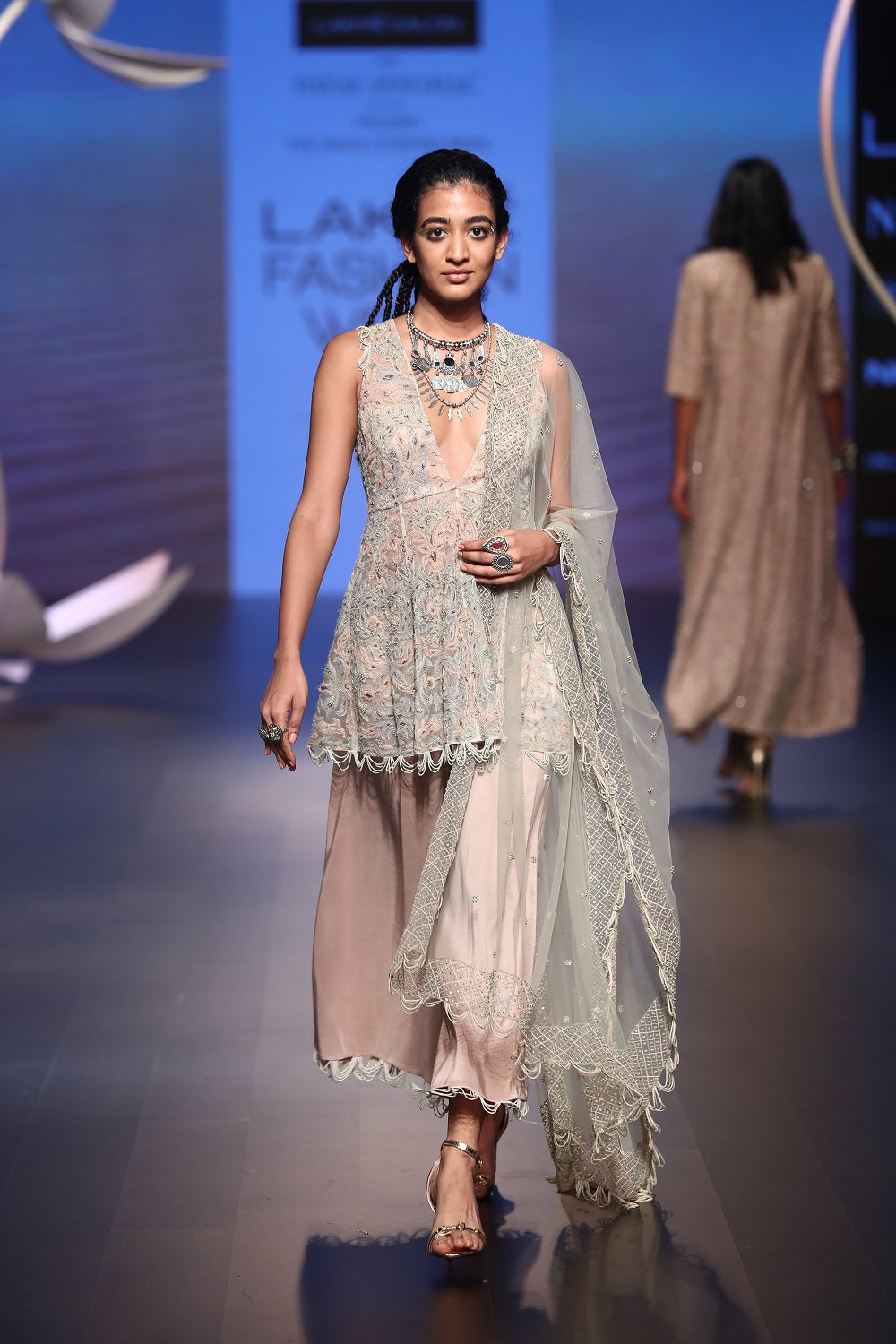 Off-white organza fray embroidered anarkali top with rose pink lining with matching silk palazzo pants and mint net embroidered dupatta