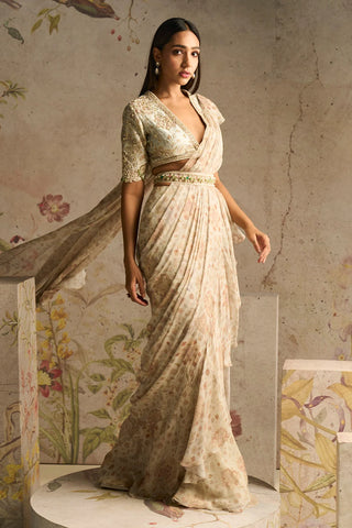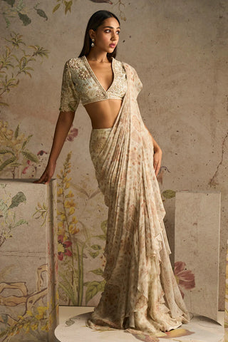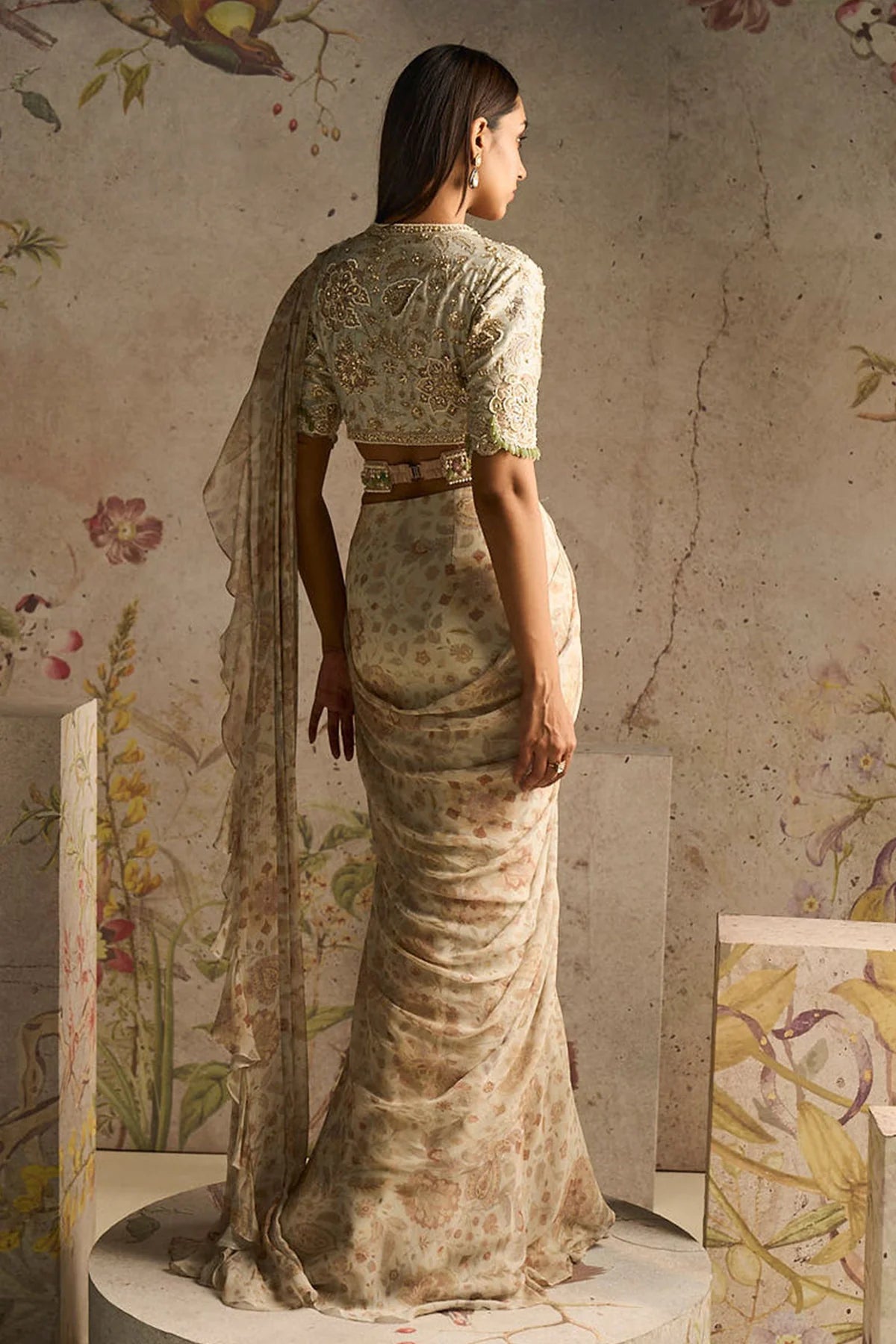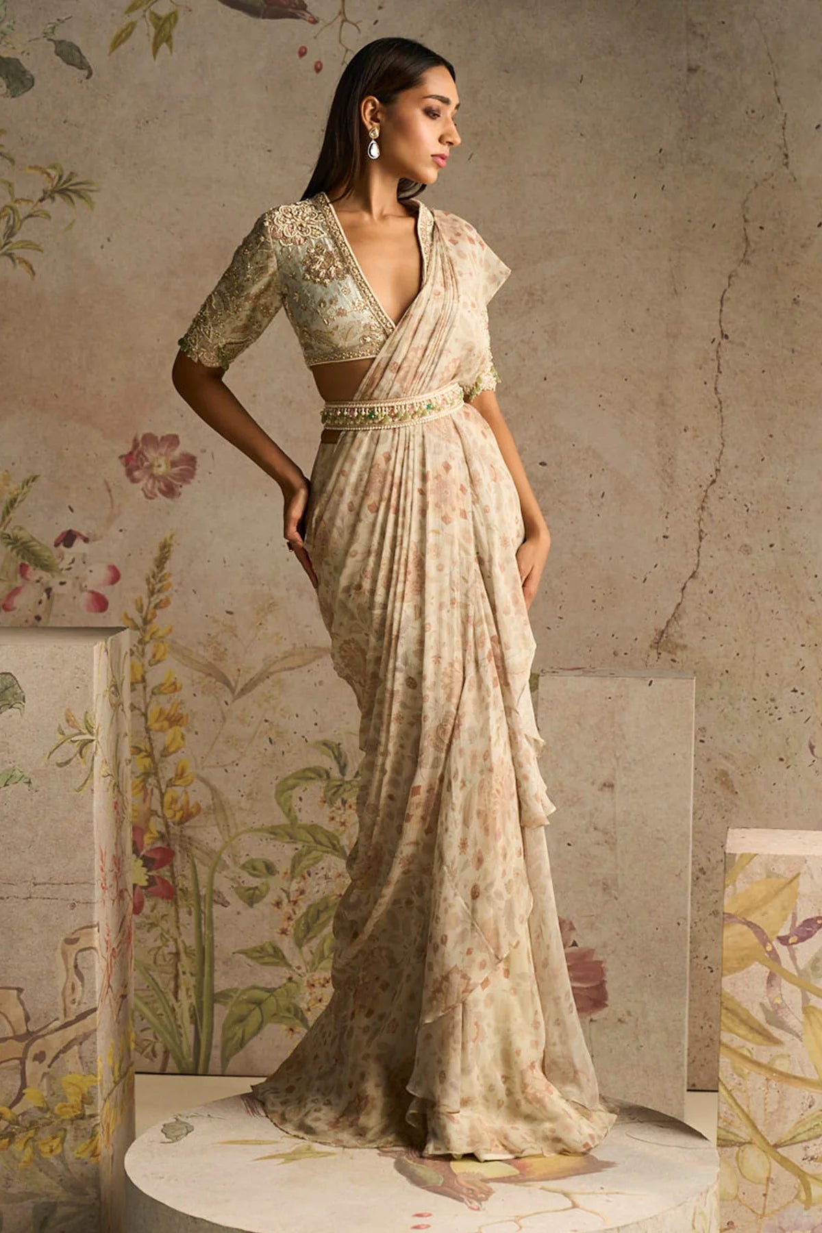 Ivory Printed Raw Silk Embroidered Blouse Paired With a Printed Chiffon Draped Saree With Printed Chiffon Ruffles
