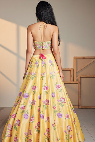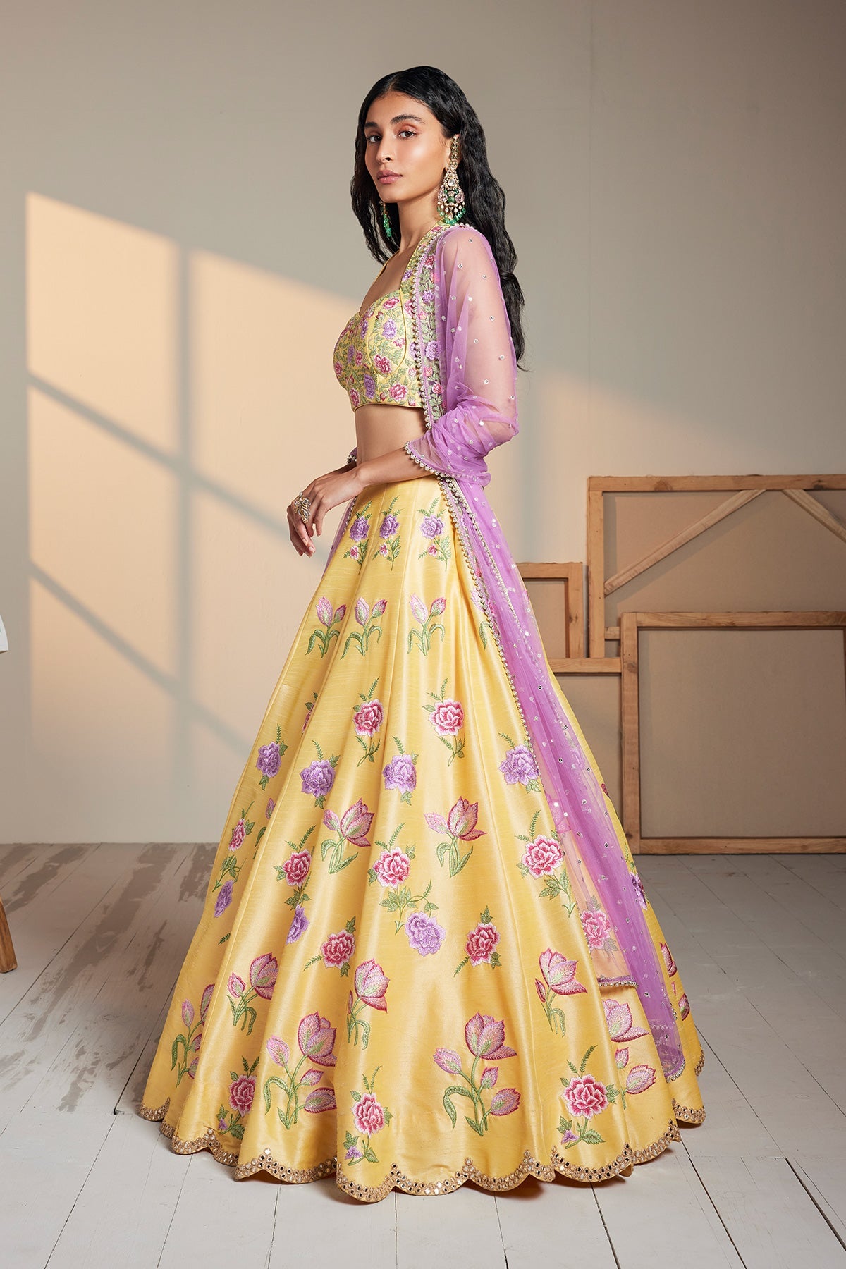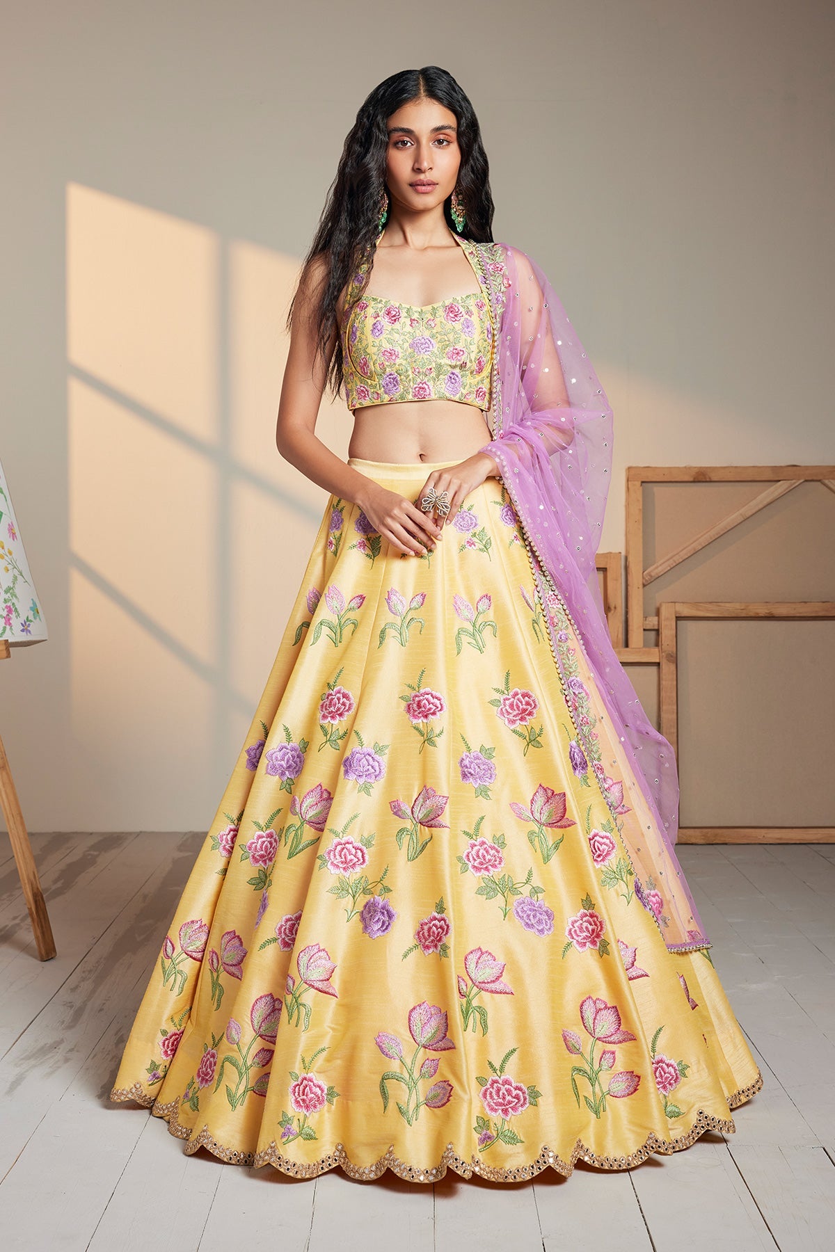 Silk-based multi-hued thread flower motif lehenga paired with delicate floral jaal embroidery on blouse and tulle dupatta.