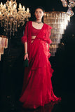 Red net allover embroidered blouse with net drape and organza chiffon draped ruffle saree paired with embroidered belt