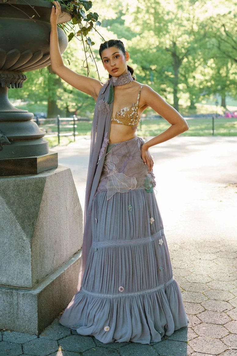 Sari - A concept sari, with a tiered skirt, lace, small hand embroidered sparkly beaded flowers, a watercolour scape of organza. Lace underlay, a georgette pallu embroidered with hand cut organza flowers, delicate lace flowers mixed with French corded embroidery and an assortment of random delicate details here and there.