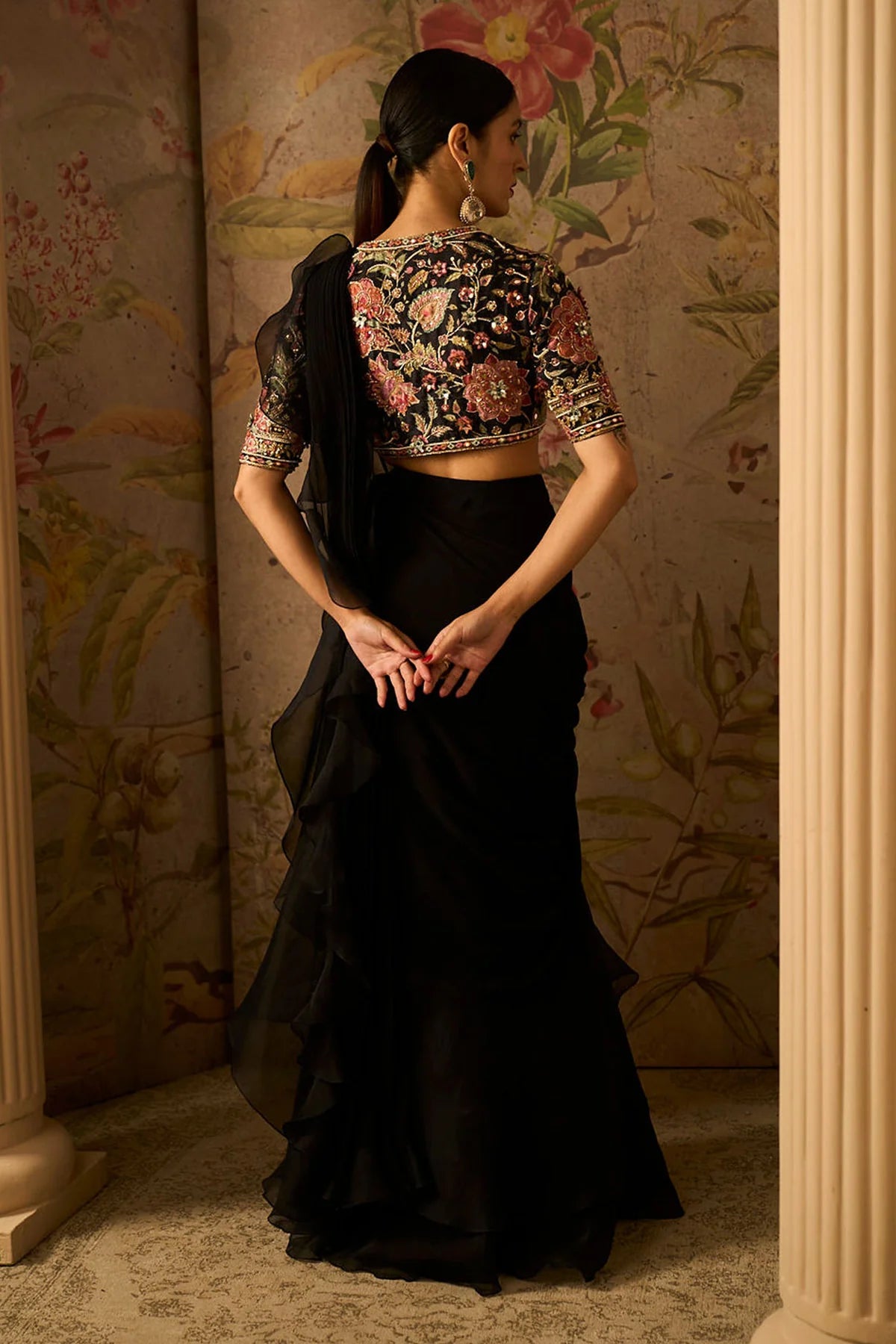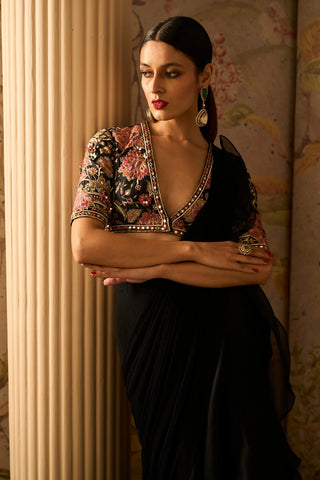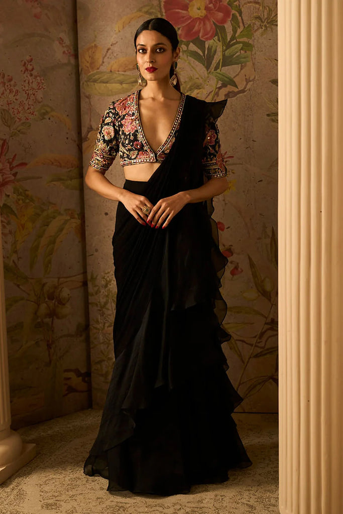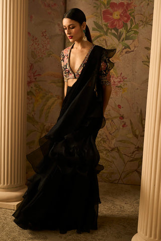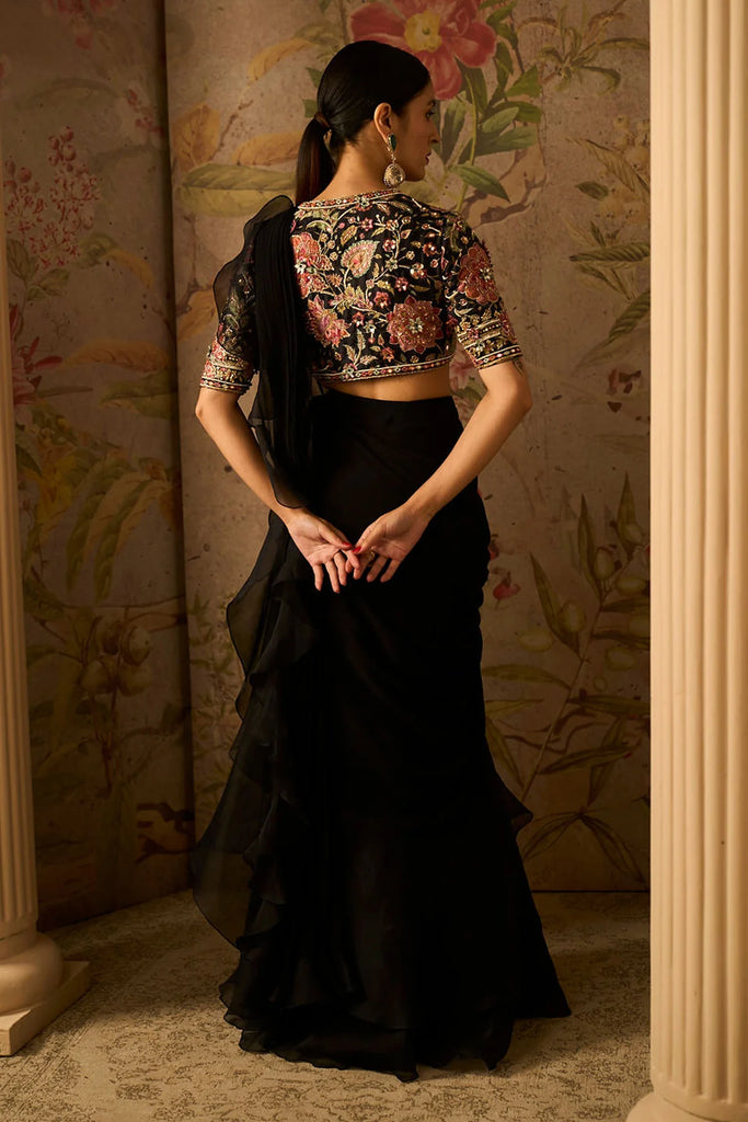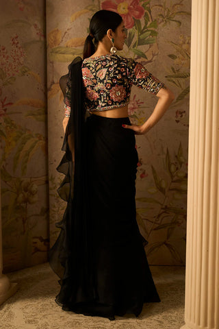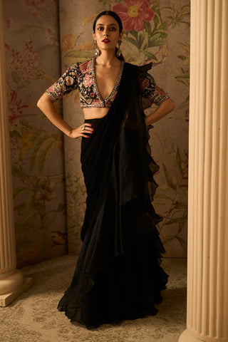 Black Raw Silk Embroidered Blouse With Mirror Embellishment Paired With Chiffon Drape Saree With Organza Ruffle